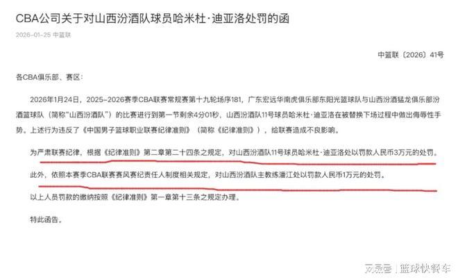 针对山西队与广东队一战,CBA终于开出罚单了。对于山西队外援迪亚洛在比赛中公开挑衅裁判,作出“数钱”动作,CBA采取了零容忍态度,直接对当事人迪亚洛开出了罚款3万的罚单,而山西队主教练潘江也被追责,罚款1万。不过,山西男篮方面则在深夜强势回应,对于网络上部分极端球迷的恶语相向,对于迪亚洛等人在内的恶意侮辱与攻击,他们也采取强硬反击,目前已经启动法律程序。