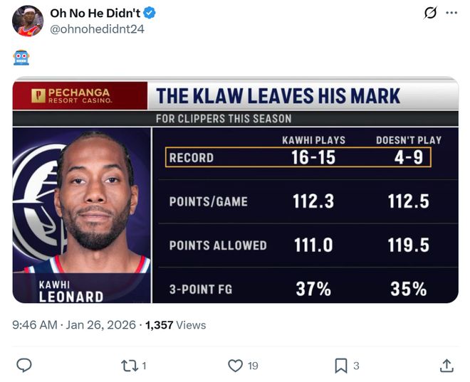 如果说哈登是兜底的基本盘,那么小卡则是决定快船队上限那个人,并且他再次用行动证明,只要健康登场自己就是联盟最好的球员之一。