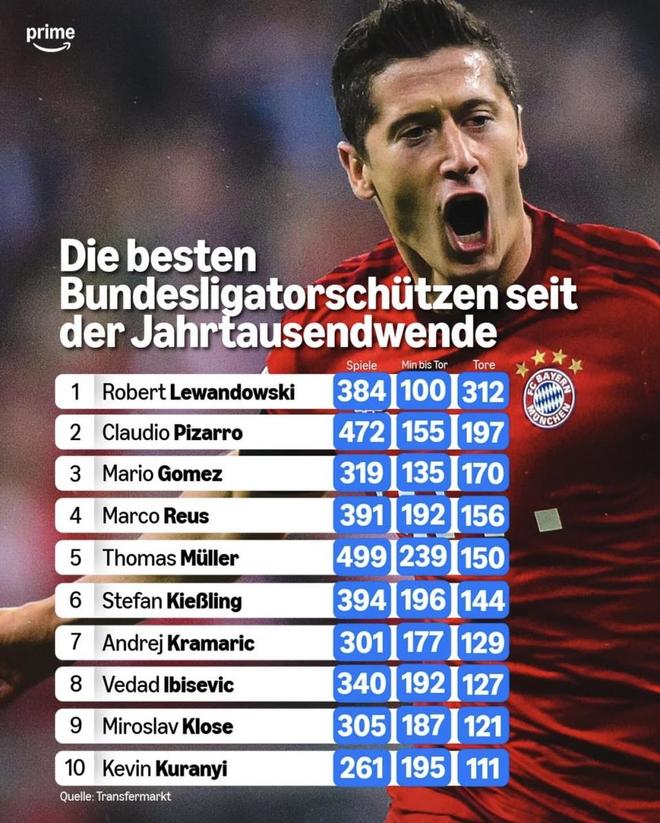 最近Prime发了《千禧年以来德甲最佳射手榜》。皮萨罗、戈麦斯、罗伊斯、穆勒这些名字都在,光看出场和进球就已经很有冲击力。更夸张的是榜首那个人,进球数直接把第二名甩出一大截,数字看着都离谱。数据截至2026年1月2日。
