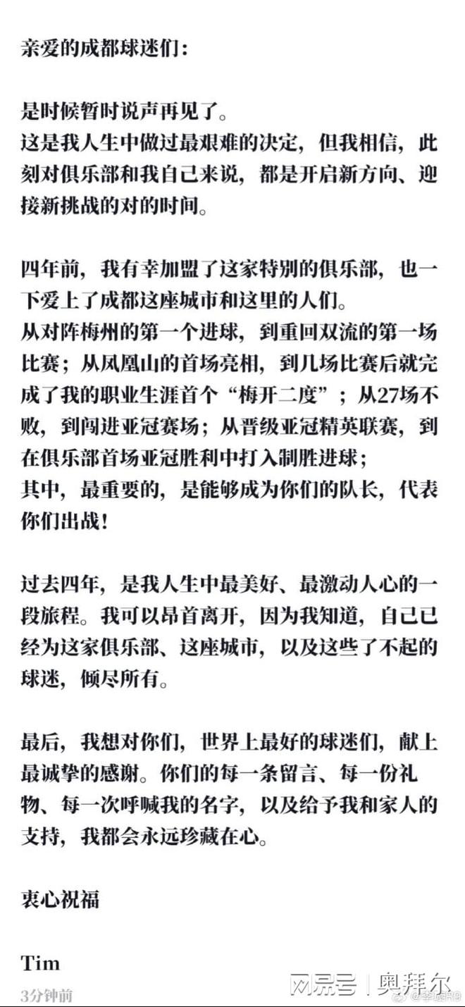 在告别信里,周定洋表示,“亲爱的成都球迷们: 是时候暂时说声再见了。 这是我人生中做过最艰难的决定,但我相信,此刻对俱乐部和我自己来说,都是开启新方向、迎接新挑战的对的时间。 四年前,我有幸加盟了这家特别的俱乐部,也一下爱上了成都这座城市和这里的人们。”