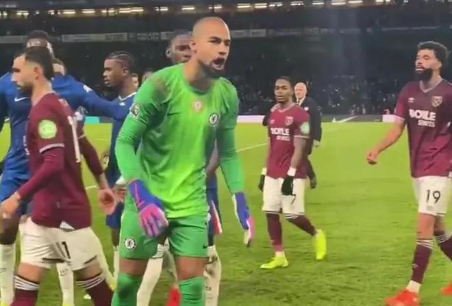 罗伯特-桑切斯在切尔西对阵西汉姆的比赛中场休息时,对着愤怒的蓝军球迷大声怒吼。