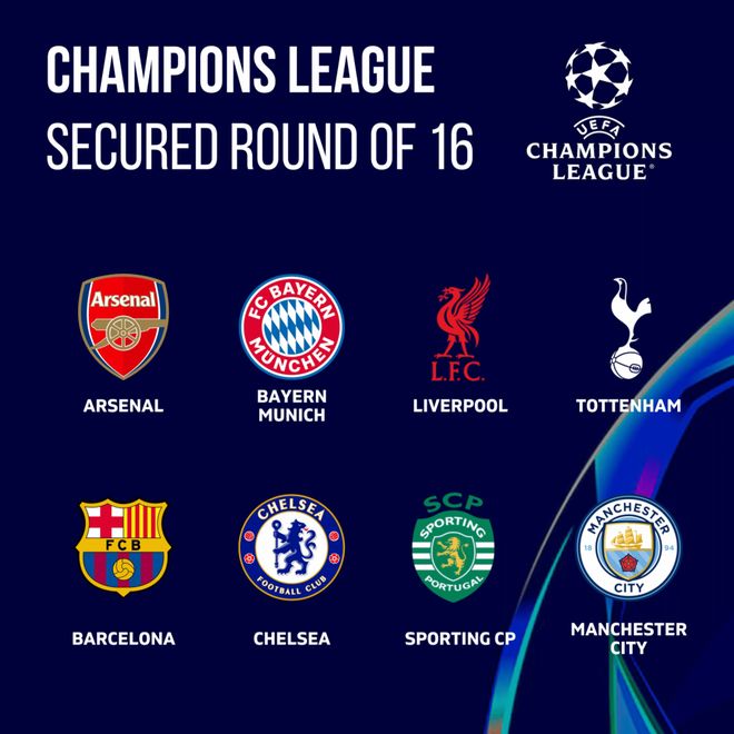 此前,阿森纳、拜仁、利物浦、热刺、巴萨、切尔西、葡萄牙体育、曼城通过联赛阶段锁定积分榜前8名,从而直通16强。